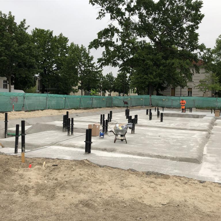 die Baugrubenumschließung mittels einer in Teilbereichen rückverankerten Spundwand aus. Der Baugrubenaushub betrug ca. 10.000 m3.