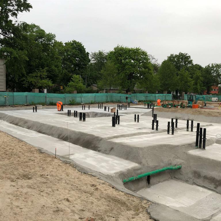 Die Schmutzwasserentwässerung der flach gegründeten Bauteile wurde über ein Schmutzwasserleitung mit einer Grundleitungslänge von ca. 1,6km hergestellt.